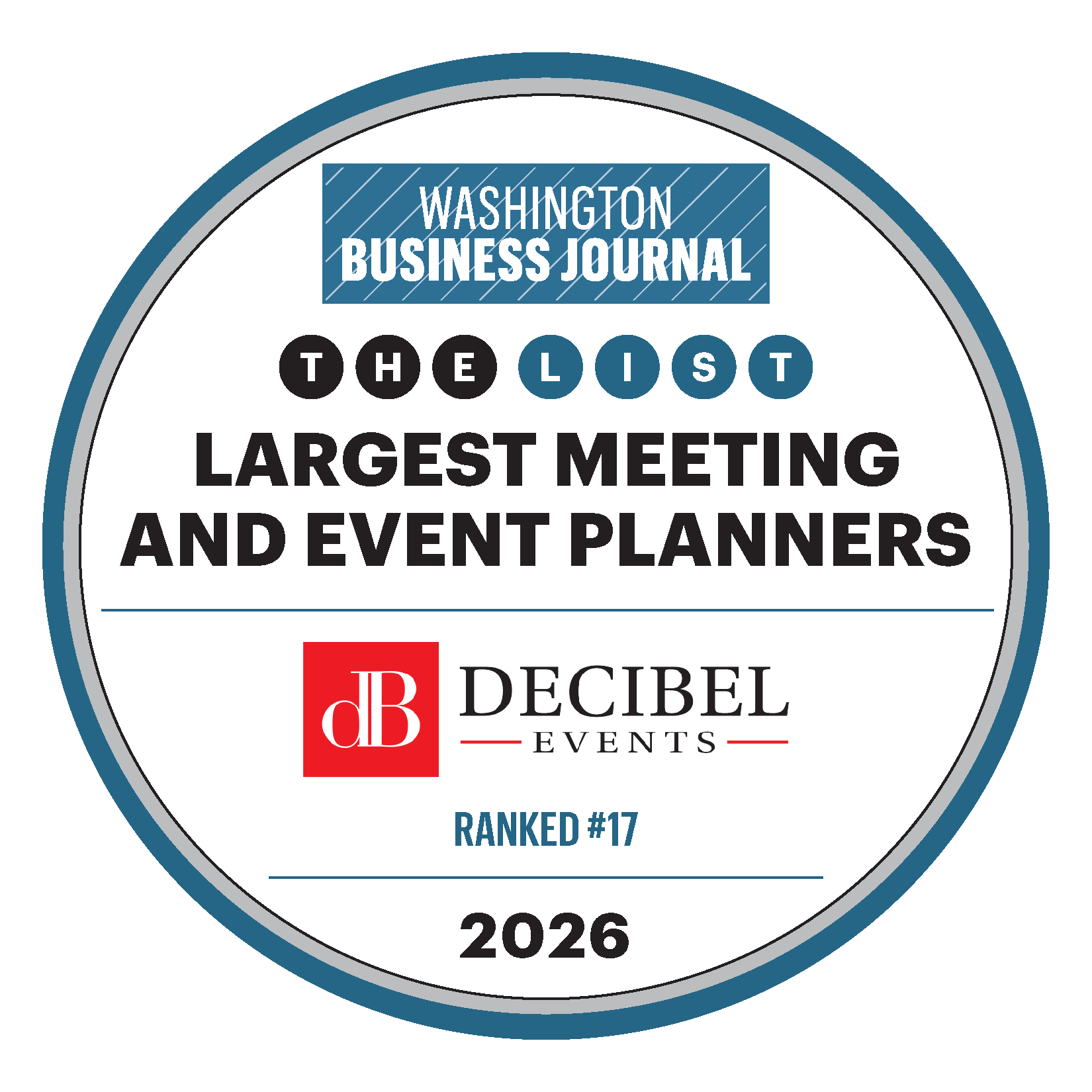 Decibel Events is proud to announce that we have been ranked #17 on the Washington Business Journal’s 2026 list of the Largest Meeting and Event Planners in Greater Washington. This annual ranking, published on February 20, 2026, recognizes the top 24 event planning and production companies serving the Washington, DC metropolitan area, ranked by the number of metro-area events produced in 2025.